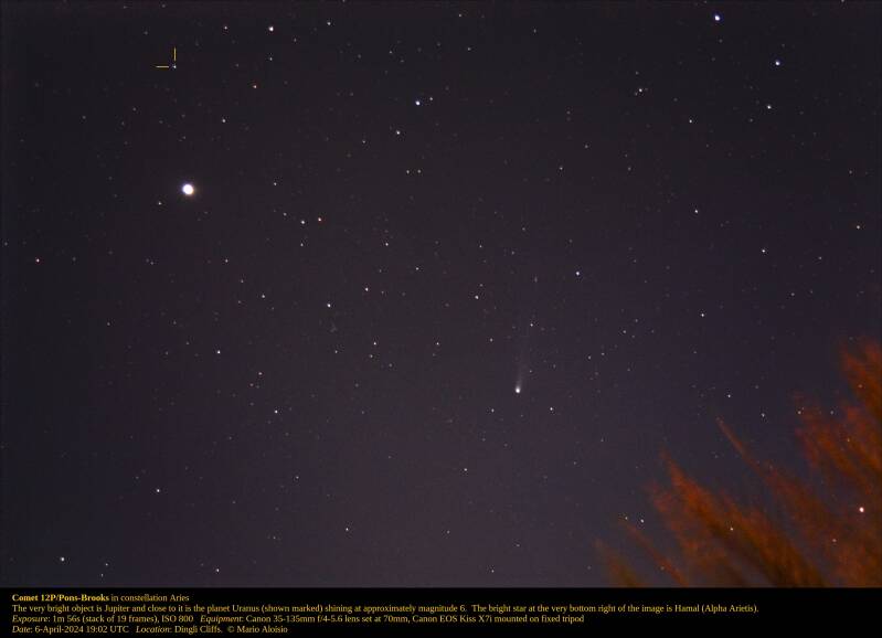 The very bright object is Jupiter and close to it is the planet Uranus (shown marked) shining at approximately magnitude 6. The bright star at the very bottom right of the image is Hamal (Alpha Arietis).